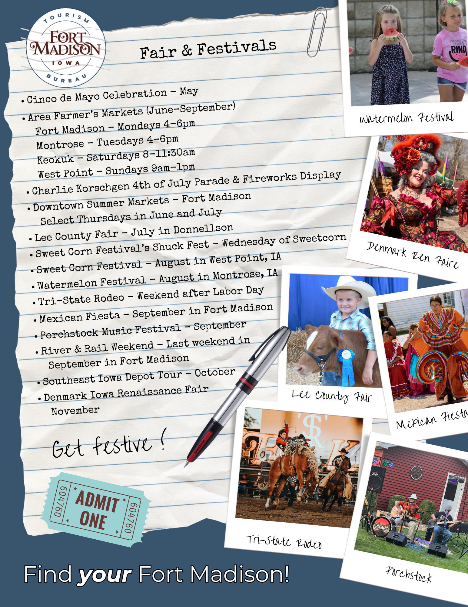 Visit Iowa’s oldest county fair, eat as much sweetcorn and watermelon that you can, cheer for your favorite bull rider, dance and eat the night away at Iowa’s oldest Mexican Fiesta, railfan trackside with others from across the world or frolick among the Royal Rogues, Renegades, Pirates and Scots at the Denmark Iowa Renaissance Faire!